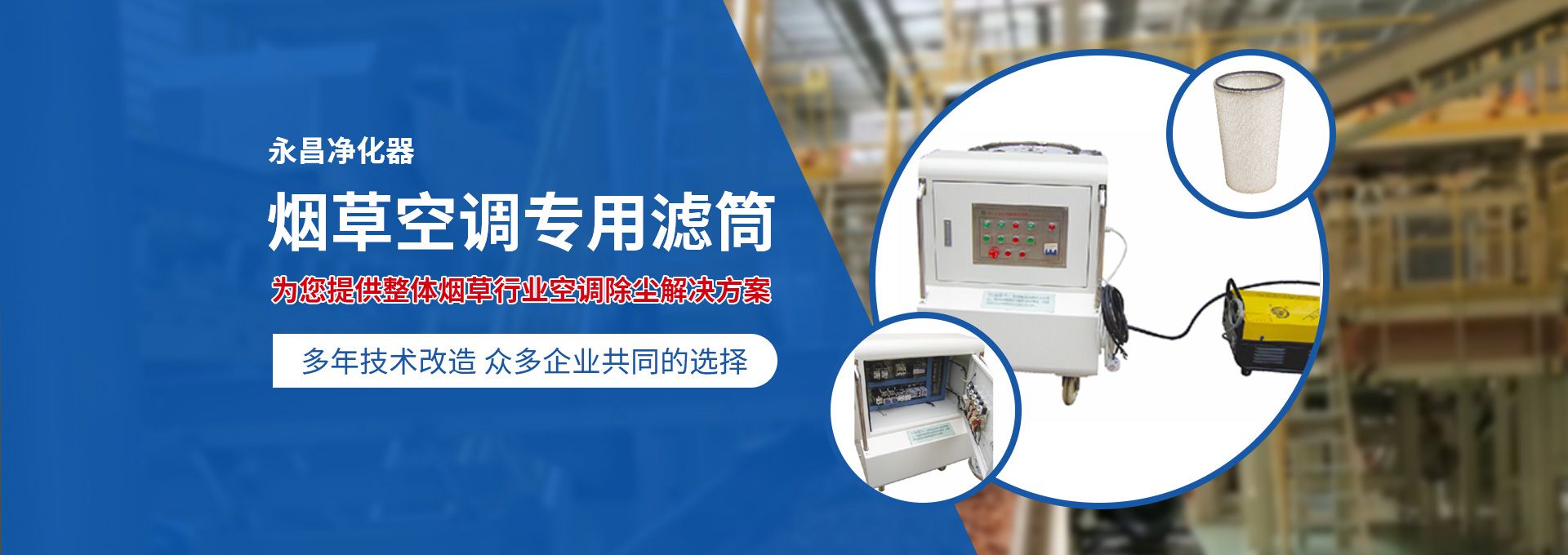 新鄉市永昌凈化器有限公司是生產煙草行業空調除塵專用濾筒的企業。注冊資金1000萬元。已通過ISO9001國際質量管理體系認證。對產品有嚴格的管理制度和售后服務。我公司以誠信、負責、守信譽、重質量的精神所生產的產品,近幾年來在煙草行業受到廣泛應用,并受到用戶的一致好評。  從一九九四年以來為煙廠的空調設備服務。十幾年來,我們不斷走出去請進來學習新技術。定期到用戶那里咨詢情況:互相交流,認真聽取寶貴意見,不斷提高產品質量。從經濟和安全,方便的角度出發,根據煙廠濕度大的生產環境和濾筒收集到的含酸堿、氧化劑的粉塵。在空調箱工作狀態下我們頂著巨大的風壓危險在箱內停留了幾分鐘,認真查看濾筒工作情況,發現濾筒有并死狀態,造成濾筒不過濾、不過風、壓差高的現象。經幾十次試驗分析,在標本兼治的原則下,有針對性的解決了這一問題。  我公司針對煙廠制絲、卷接包、混絲間、儲絲房、冷卻床、梗膨化等不同的生產環境,